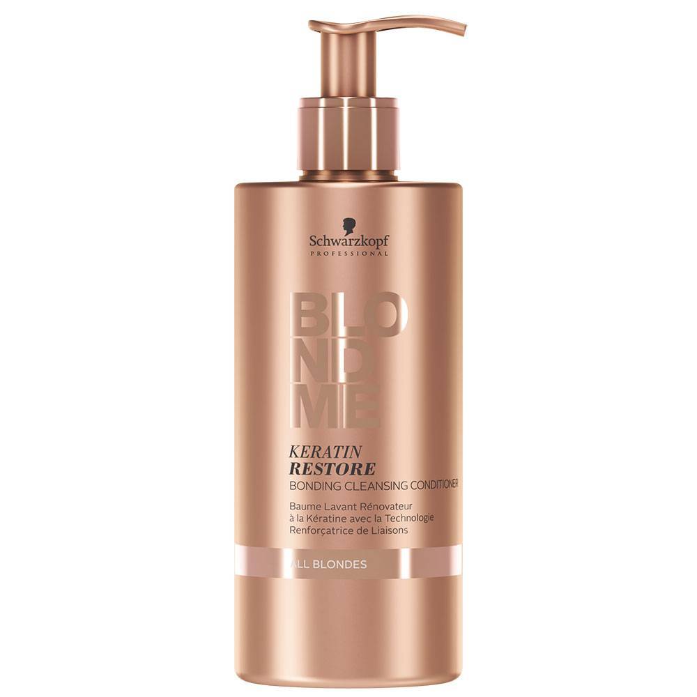 Schwarzkopf BlondMe Keratin Restore Cleansing Conditioner All Blondes is een cleansing conditioner die je lokken reinigt op een milde wijze en tegelijkertijd verzorgt. Perfect voor lokken die beschadigd zijn tijdens een ontkleur behandeling of door de blondering.åÊDeze cleansing conditioner helpt beschadigde haren te herstellen, zodat je weer optimaal kan genieten van je briljante, blonde haarkleur. De cleansing conditioner ontwart je haren, waardoor het makkelijker doorkambaar wordt. Ook wordt de natuurlijke vochtgehalte van je haren weer in balans gebracht en worden poreuze delen weer aangevuld, oftewel hallo prachtig, glad haar! De conditioner is verrijkt met keratine en marula olie. Het brengt het natuurlijke vochtgehalte weer in balans en creÌÇert nieuwe haarbruggen in de haarschacht, zodat het haar weer sterker wordt. Voor voelbaar zacht, merkbaar gezond en zichtbaar mooier haar.